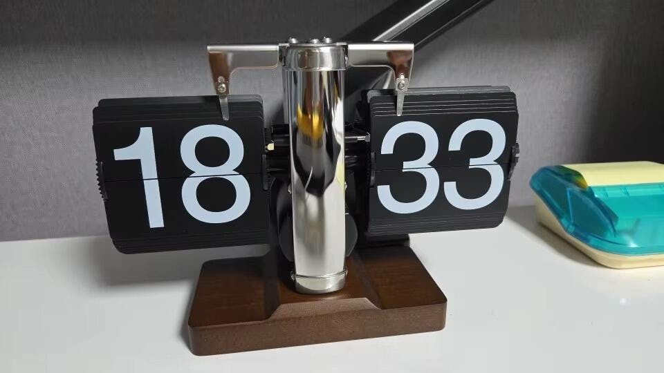 Inspirée des anciens réveils de gare, cette horloge à volets mécaniques affiche les heures avec élégance et minimalisme. Son design à chiffres basculants, son socle en bois et sa mécanique visible en font un véritable objet décoratif. Parfait pour le bureau, la bibliothèque ou la table de chevet.